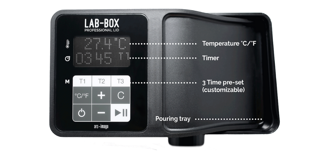 Le couvercle professionnel LAB-BOX est un couvercle supplémentaire pour le LAB-BOX avec minuterie et thermomètre intégrés. C'est une alternative professionnelle au couvercle standard.