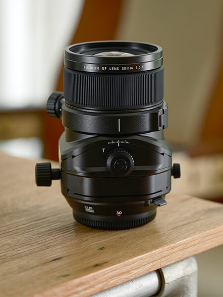 Le GF30mmF5.6 T/S offre un réglage de bascule permettant de faire pivoter leur axe optique, d’effectuer un réglage de décentrement, et de déplacer son axe optique parallèlement au capteur. Il est alors possible de modifier la relation entre son axe optique et le plan image, afin de manipuler les zones nettes et la perspective.
