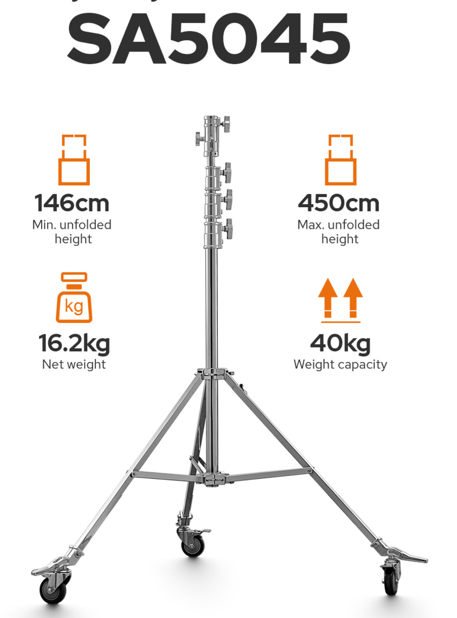 Nous vous présentons ici les supports à rouleaux en acier très résistants SA5015 et SA5045, qui peuvent tous deux supporter jusqu'à 40 kg. La hauteur dépliée du SA5015 va de 92 cm à 168 cm, tandis que le SA5045 va de 146 cm à 450 cm. Les deux supports sont dotés d'un pied réglable, d'un récepteur Junior de 1-1/8" et d'un axe rétractable de 5/8" qui peut être pivoté de 90 degrés. Recommandé pour le système de mise au point de la lumière parabolique, M600D, M600Bi, et MG1200Bi.