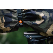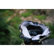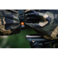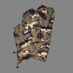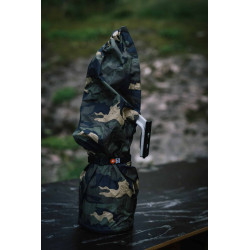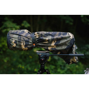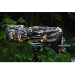Les housses de pluie sont fabriquées d'une seule pièce, conçues sans couture et avec un devant élastique maintenant la housse en place. Une longue fente velcro laisse de la place au pied d'objectif. L'arrière recouvre l'appareil photo et peut être fermé avec un cordon de serrage.